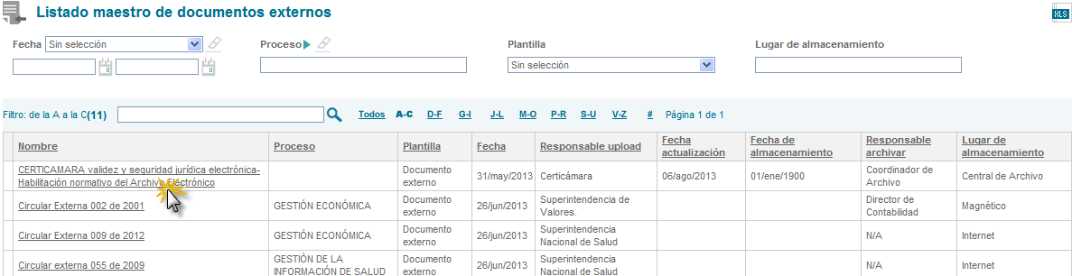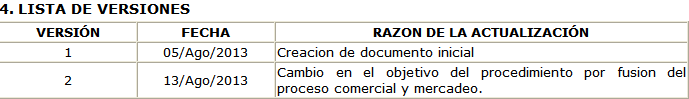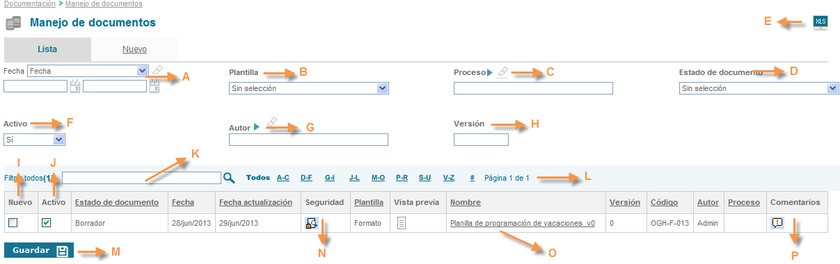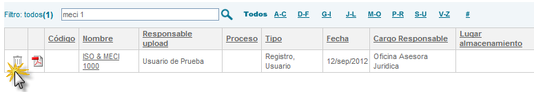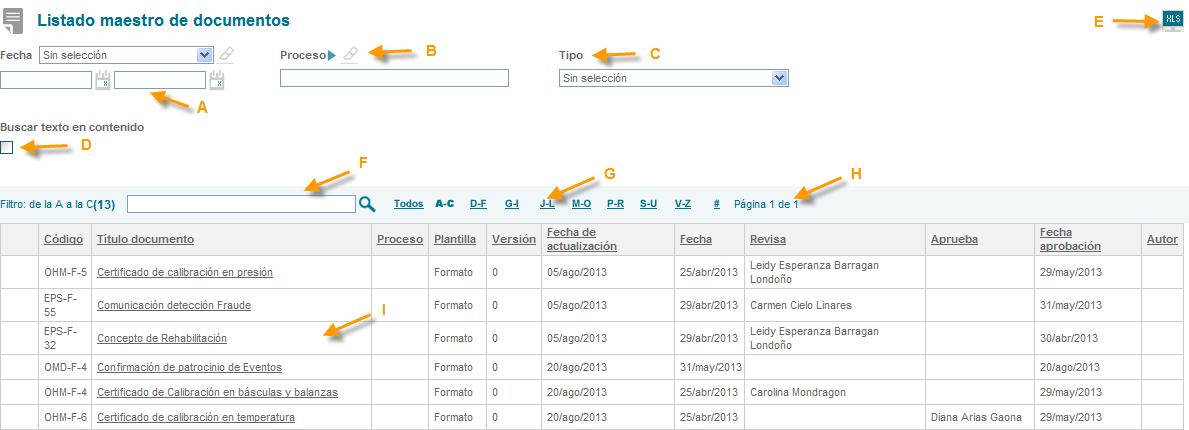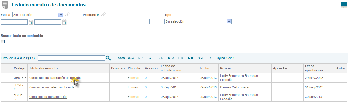 En el cuadro de resultados, encontrara cinco columnas que le permitirán identificar la plantilla del documento, el código, el titulo, la versión y la fecha en la que se realizo la última actualización.