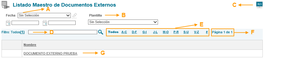 B: Filtro alfanumérico para búsqueda de categorías ya creadas.