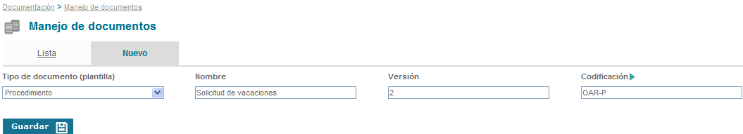 Nombre: Campo texto para ingresar la primera sigla de la codificación de los documentos.