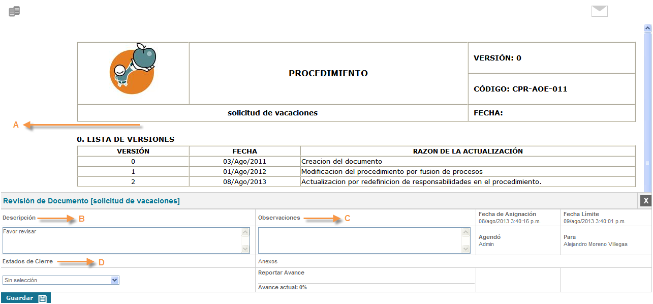 C: Nombre del documento. Se debe dar clic sobre el titulo del documento a notificar.