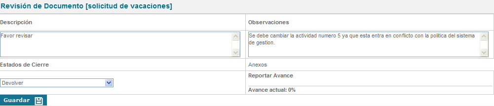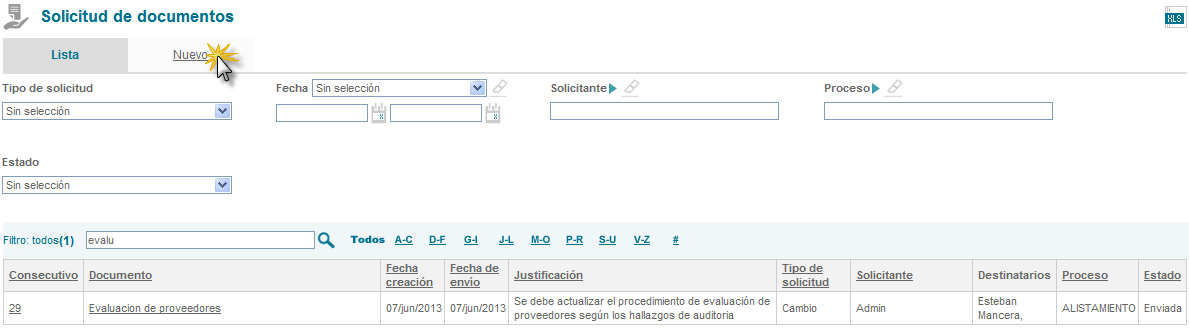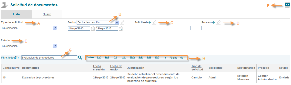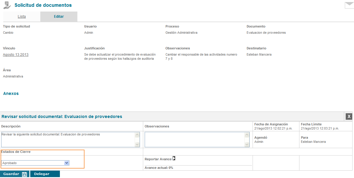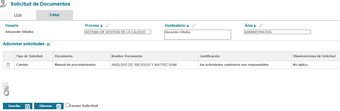 Nota: El listado de Solicitud documental es una lista de valor llamada TipoSolicitud administrable desde el modulo de administración.