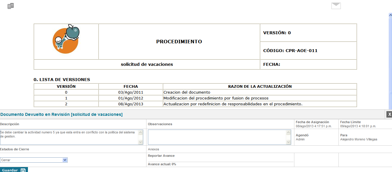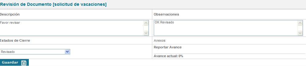 Ingresando a esta tarea se encontrará el contenido del documento notificado, en la parte inferior se muestran los campos para cerrar la tarea.