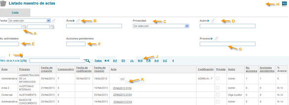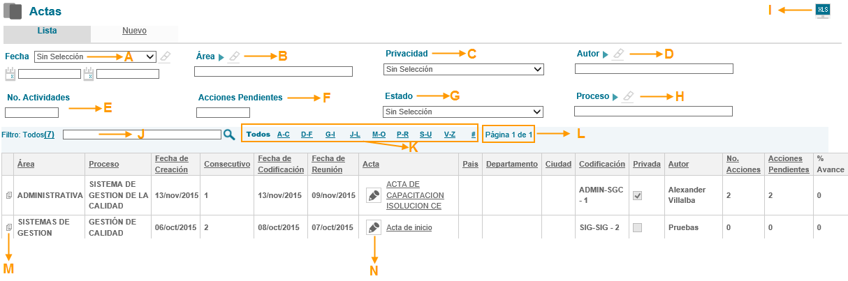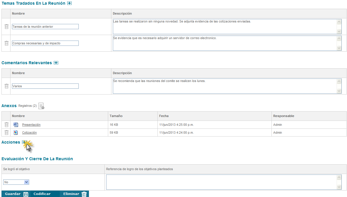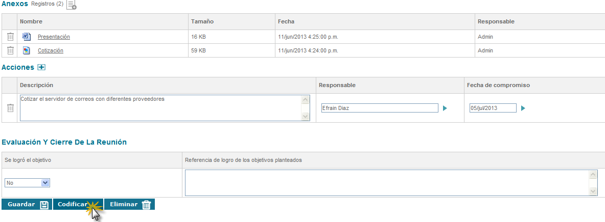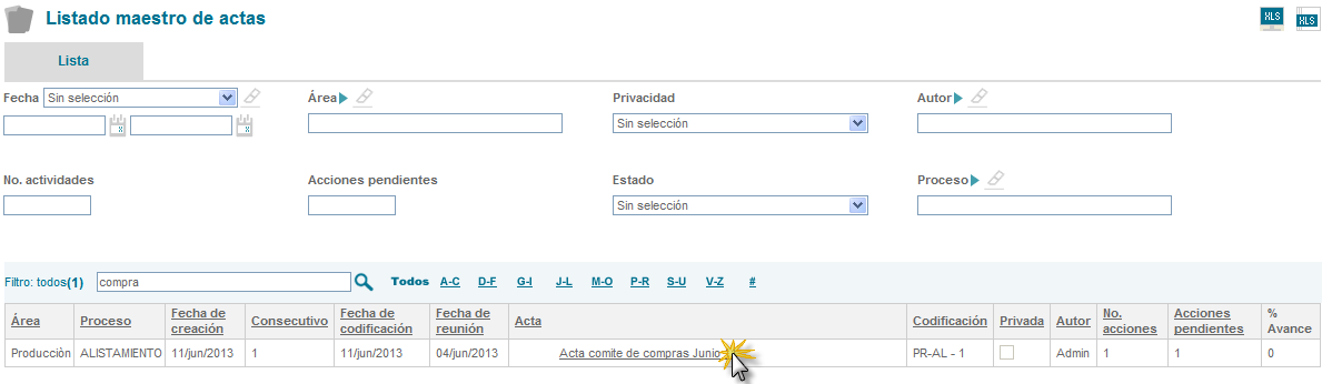 Codificación: El código de las actas se genera automáticamente de la siguiente forma: Sigla del área – Sigla del proceso – Consecutivo.