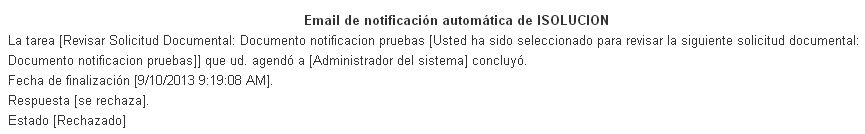 Al cerrar la tarea, el usuario elaborador recibirá una notificación al correo electrónico configurado, donde se informa el resultado de la solicitud.
