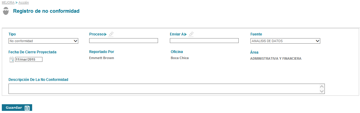 Reportado Por/Oficina/Área: Datos del usuario que está reportando la no conformidad por default estos no son modificables vienen de la información inicial que se ha ingresado en la tabla de creación de usuarios.
