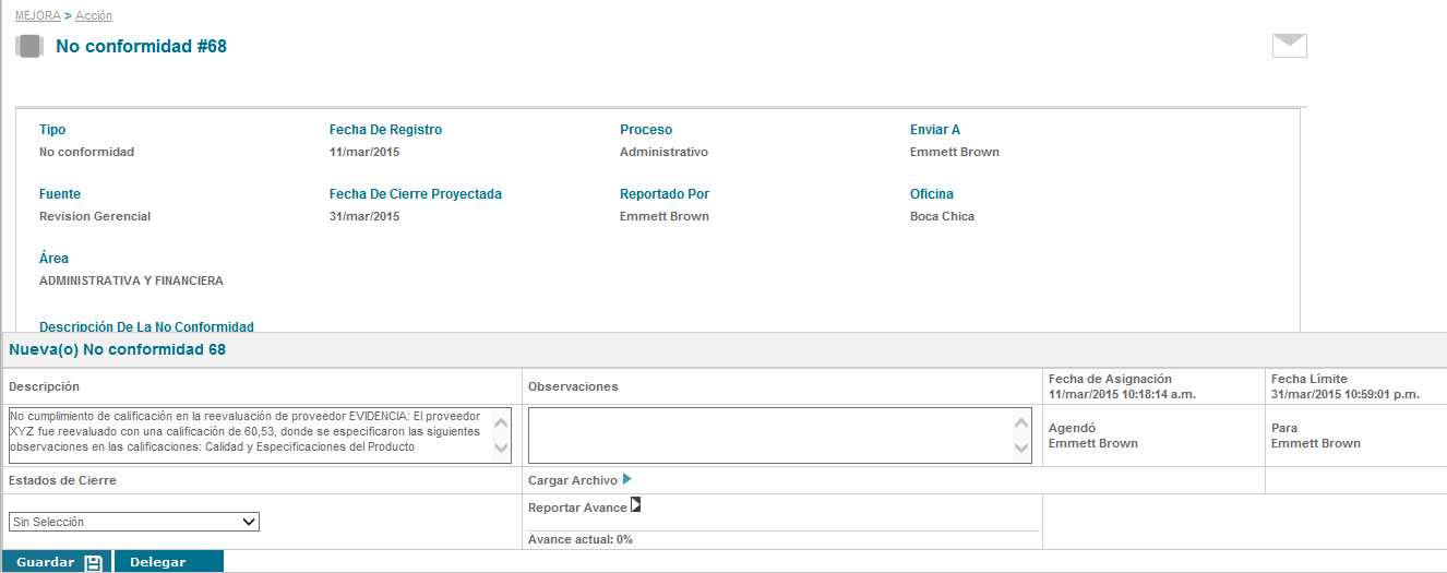 Ingresando a esta tarea se mostrarán los datos de la no conformidad y las secciones para realizar la respectiva gestión.