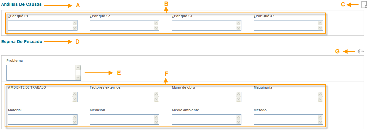 Titulo “Análisis de causas” que contiene los campos para incluir la respuesta a cada porqué.
