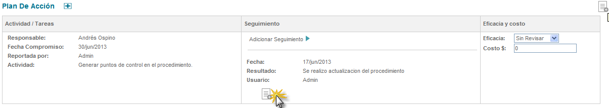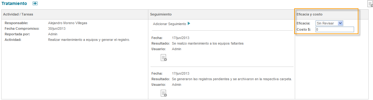 Nota: Los campos de eficacia y costo de las actividades lo dará el responsable de la no conformidad; o según esté configurado el parámetro “Seleccione el responsable de cerrar las Actividades de Tratamiento en Mejoramiento Continuo.” (Ver manual de parámetros públicos)