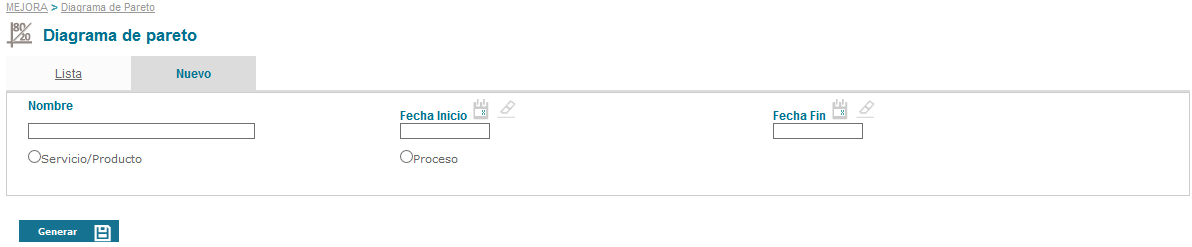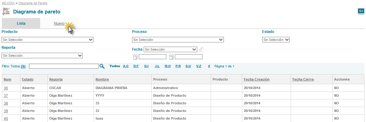 Al ingresar a la opción aparecerá la siguiente pantalla con las opciones de visualizar los diferentes paretos creados y con la opción de crear uno nuevo.