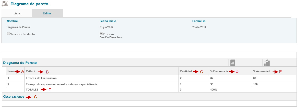 Luego deberá ingresar a la opción de Diagrama de Pareto donde le permite priorizar la información proporcionada por un conjunto de datos o elementos enlazados de una acción.