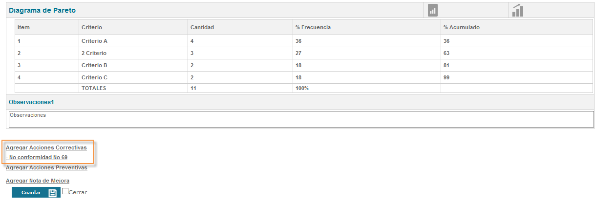 Diagrama de Pareto: En esta sección, permite realizar un análisis gráfico de datos, permitiendo asignar prioridades a los diferentes tipos de fallas que se presentan los productos no conformes y no conformidades del sistema de gestión.
