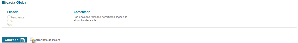 Eficacia: Lista desplegable con los valores “Si” y “No”. Para cerrar la actividad se debe seleccionar alguna de las dos opciones.