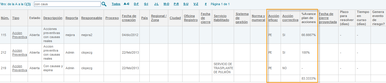 El listado de acciones correctivas funciona igual que el listado de acciones preventivas.