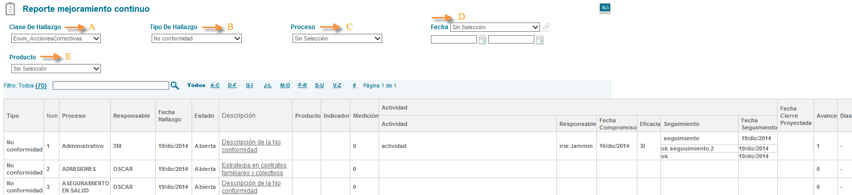 Nota: Los filtros que se muestran para cada tipo de acción correctiva dependen de la parametrización de estos tipos de acciones.
