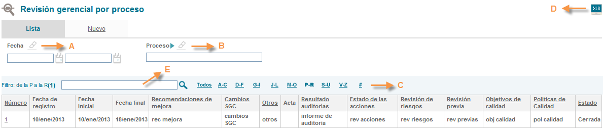 C: Filtro alfanumérico para búsqueda de revisiones gerenciales corporativas ya creadas.