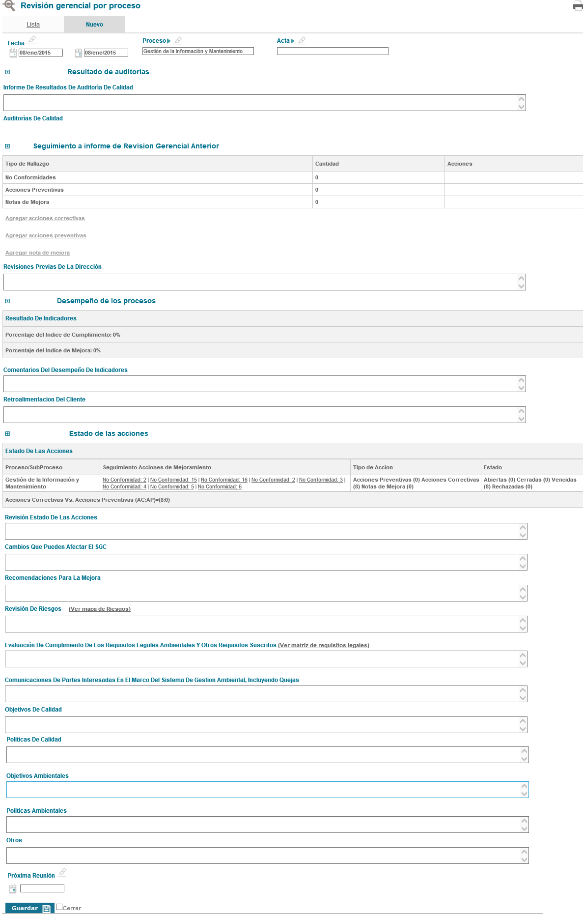Después de cerrar la revisión gerencial por proceso, al crear de nuevo otra revisión gerencial del mismo tipo, en la sección “Seguimiento de revisión gerencial anterior” se visualizaran las acciones creadas en la revisión anterior.