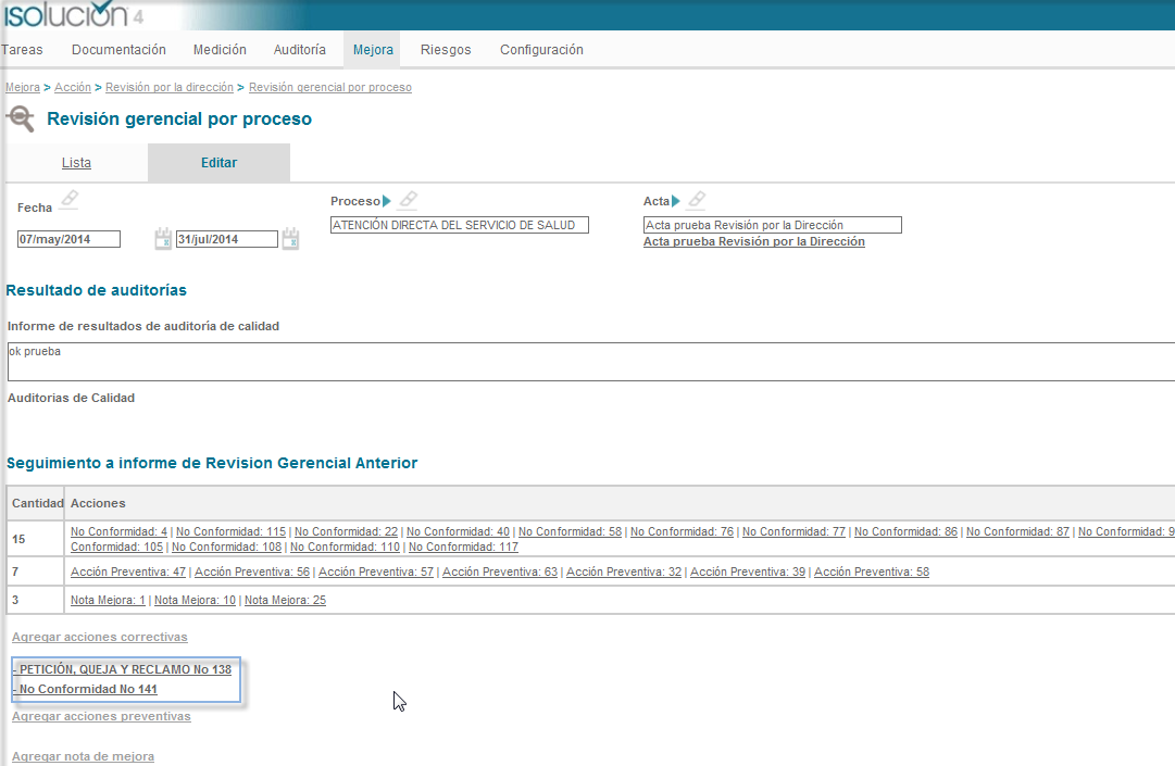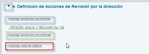Definición de Acciones Previas de revisión por la dirección: Al desplegar la fecha aparecen links para agregar acciones, se pueden agregar acciones correctivas, preventivas y de mejora.