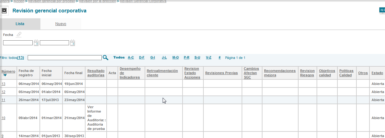 Al ingresar a la opción muestra el listado de las revisiones gerenciales corporativas creadas: