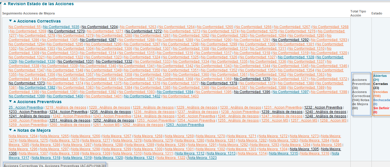 Revisión estado de las acciones: Vínculo a las acciones correctivas, acciones preventivas y notas de mejora, muestra un resumen según el estado (Abiertas, cerradas, vencidas, rechazadas, sin definir).