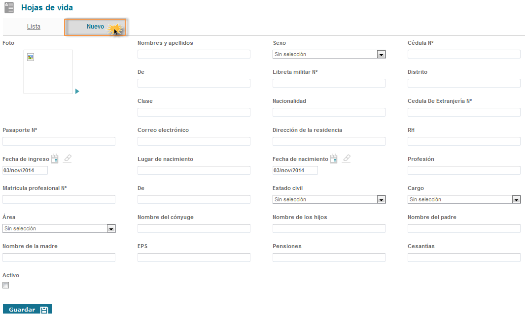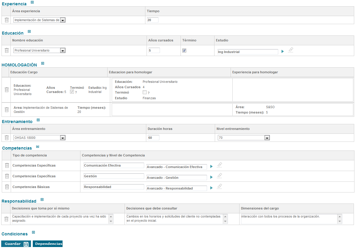 : Para eliminar un cargo, se deberá dar clic en el botón, si no se encuentra habilitado y frente a este aparece el botón “Dependencias”, esto indica que el cargo se encuentra relacionado dentro del sistema y no podrá ser eliminado mientras exista este vínculo.Esta sección permite crear y/o modificar las hojas de vida y perfile de cargo del personal de la compañía.