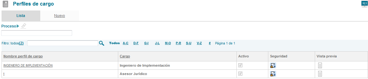 Al dar clic en esta opción, se ilustrará los filtros necesarios para buscar los perfiles de cargo creado y las dos opciones de “Lista” y “Nuevo”.
