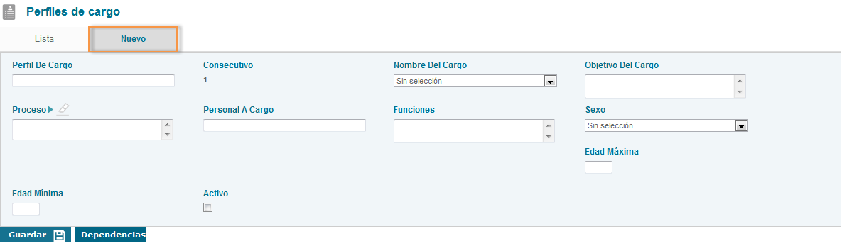 Para adicionar un nuevo perfil de cargo, se debe seleccionar la opción Nuevo: