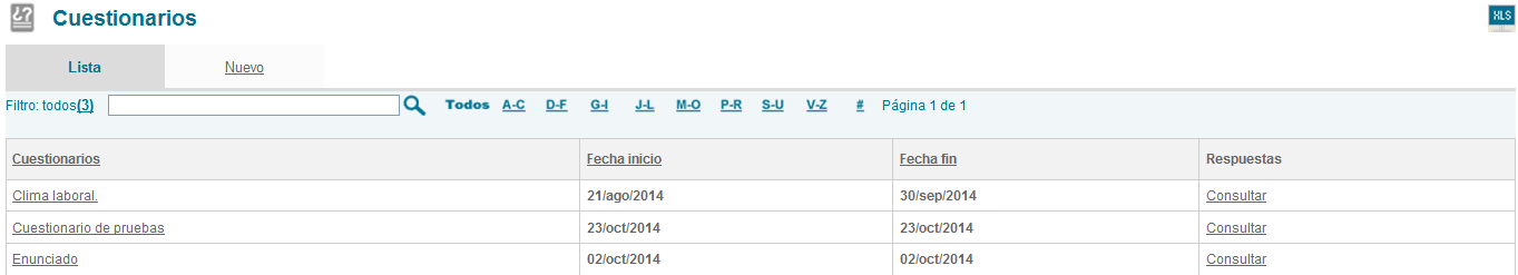 el sistema creara el formulario y mostrara el mensaje que se ha guardado la información, remitiendo al usuario a la lista de cuestionarios disponibles.