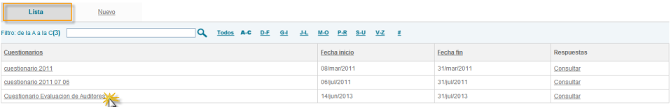 Para acceder al cuestionario se debe hacer clic sobre el nombre del mismo, donde este automáticamente nos lleva a responder cada una de las preguntas asociadas (Una vez contestado y guardado el sistema tomara la información del usuario que respondió y con el cual se encuentra logueado), en caso de no poder responder el cuestionario el sistema mostrará un mensaje informando el porque no puede ser contestado.