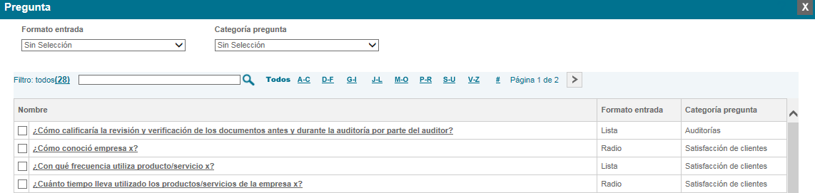 Al ingresar el usuario encontrara dos filtros que le facilitaran la búsqueda de las preguntas por formato de entrada y categoría de pregunta, a su vez la puede buscar por texto o selección alfanumérico.