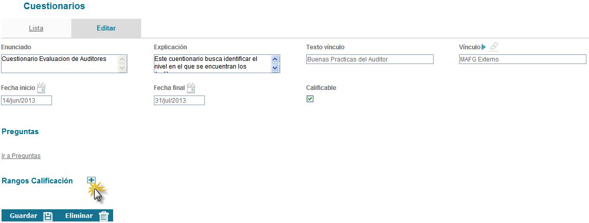 Es necesario ingresar al cuestionario generado, y el sistema habilitara Preguntas y Rangos de Calificación.