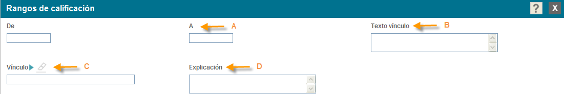 En este link se encuentran las casillas que permiten la asignación de rangos en los que se calificaran las respuestas al cuestionario una vez se de clic en el signo se desplegara una ventana con los siguientes campos: