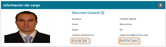 Se puede visualizar al consultar el cargo seleccionado la información básica del empleado, como: Nombre, Sexo (género), Edad, Correo electrónico. Se debe recordar que está información es la registrada a través de la opción de Hojas de vida en listado maestro perteneciente a este módulo.