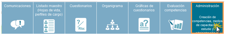 Este módulo permite crear perfiles de cargo, hojas de vida, evaluaciones o cuestionarios y visualización de resultados, publicaciones y organigrama; y por otro lado, administrar las competencias y capacitaciones.