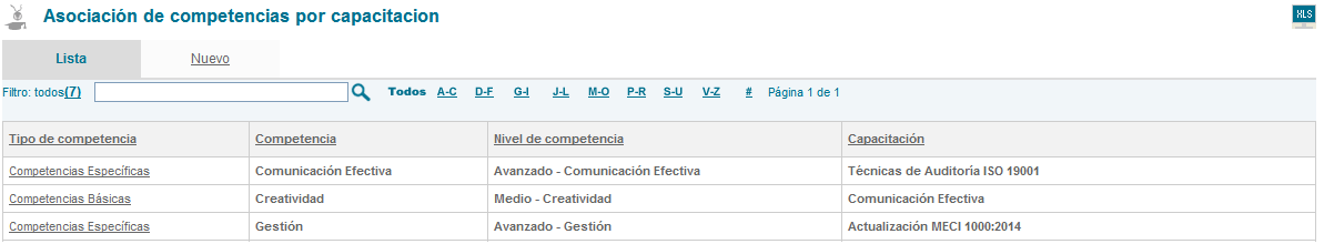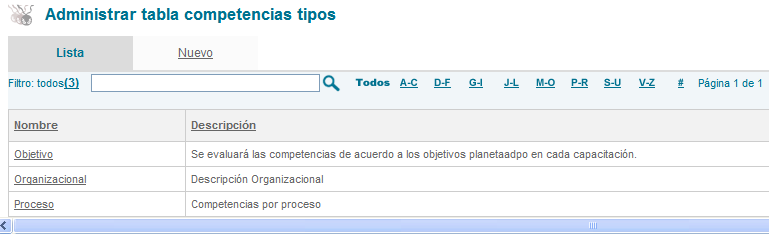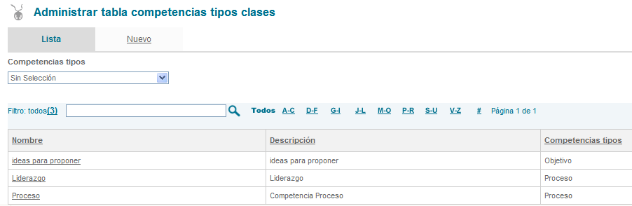 Al dar clic en esta opción, se ilustrará los filtros necesarios para buscar las competencias creadas y las dos opciones de “Lista” y “Nuevo”.