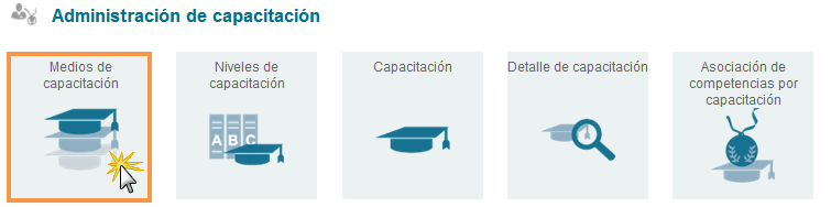 Está opción permite adicionar, modificar o eliminar un medio de capacitación, que posteriormente será vinculado dentro de alguna capacitación creada; estos medios de capacitación pueden ser por ejemplo; A distancia, Presencial, Semi presencial, Virtual, etc.