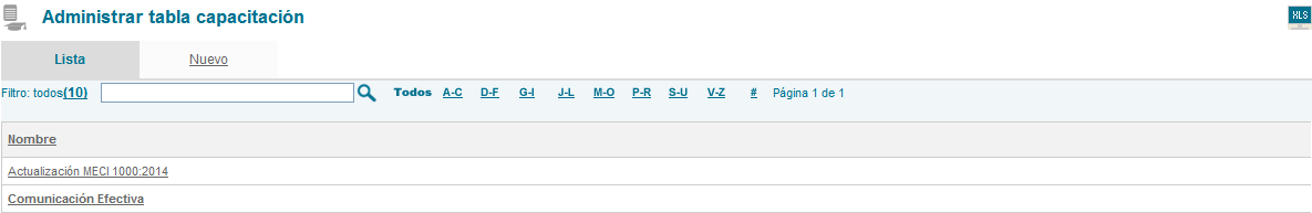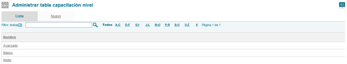 Al dar clic en esta opción, se ilustrará los filtros necesarios para buscar los niveles capacitación creada y las dos opciones de “Lista” y “Nuevo”.
