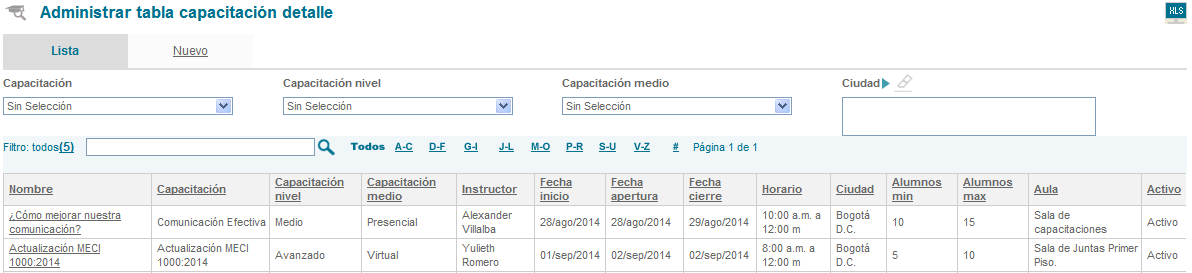 Al dar clic en esta opción, se ilustrará los filtros necesarios para buscar los nombres de las capacitaciones o cursos creados y las dos opciones de “Lista” y “Nuevo”.