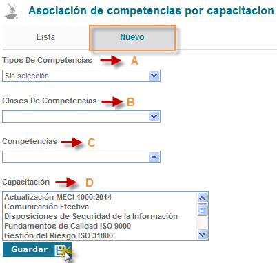 Capacitación:Es un campo de lista de desplegable de selección del nombre de la capacitación a realizar.