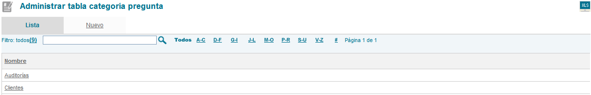 Al dar clic en esta opción, se ilustrará los filtros necesarios para buscar los nombres de las categorías de preguntas creadas y las dos opciones de “Lista” y “Nuevo”.